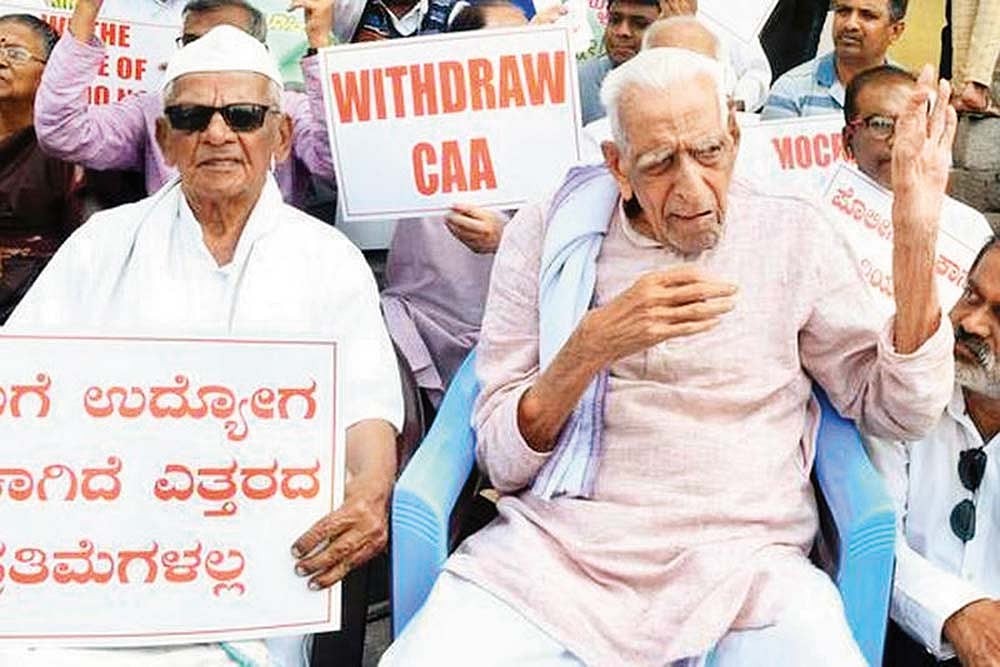 At 102, the venerable freedom fighter—who has just concluded a five-day protest against the Citizenship (Amendment) Act (CAA) at Bangalore’s Town Hall earlier in the day—is mounting yet another campaign. This, he says, must go on up to the 2024 general elections and there will be demonstrations three days every month. The countrywide anti-CAA protest, even if sporadic, has “shaken the entire political scene” and he feels it should be taken forward in an organised manner.
