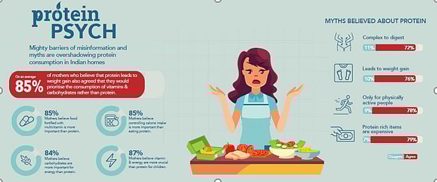 The survey identified several myths overshadowing protein consumption in Indian households, thus leading to protein-deficient food choices. Over 70% of the mothers surveyed held incorrect beliefs that protein is hard to digest, leads to weight gain, is unaffordable and is only required by physically active people. Associated myths that emerged include beliefs that protein should only beeaten at breakfast and avoided at night. As a result, such beliefs are directly influencing a conscious under-consumption of protein in the daily diet. For example, over 85% of the mothers agreed that they would value carbohydrates and vitamins over protein consumption. They also agreed that it was more important to control calories rather than consume protein.
