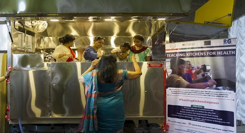 It was a rain soaked afternoon in a busy traffic area of Greater Kolkata on August 29, 2019. A group of enthusiasts gathered to experience the success story of an action project that has targeted malnutrition through education of nutrition to slum dwelling mothers. A Mobile Teaching Kitchen (MTK) run by slum women of Kolkata was parked in the location and eight neatly dressed women, beaming with confidence and joy, independently ran the business—explaining efficiently and articulately to their customers the nutrition value of the templates they were serving. On that day, the food template included gola roti (a flat bread made of wheat, gram flour and vegetables), split chick peas curry, egg curry with capsicum, tomato and onion, and chikki (sweets made of sesame seeds, peanuts, jaggery and ghee).