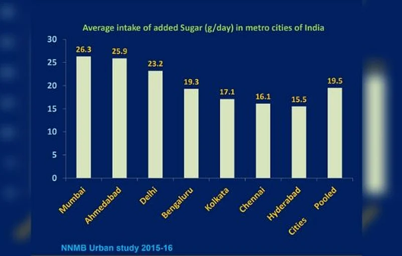 The study has revealed that the mean intake of added sugar among metro cities of India, measured in grams per day, is highest in Mumbai and least in Hyderabad, according to a report based on a survey undertaken by Indian Council of Medical Research (ICMR)- National Institute of Nutrition (NIN), Hyderabad, and sponsored by International Life Sciences Institute -India (ILSI-India).