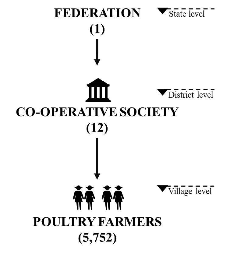 The layer cooperative society procures critical inputs such as vaccines, chickens, and feed, which are stored in a central warehouse in the district. The supply of the feed is coordinated among a central supervisor and the village supervisor, which is then distributed to farms.