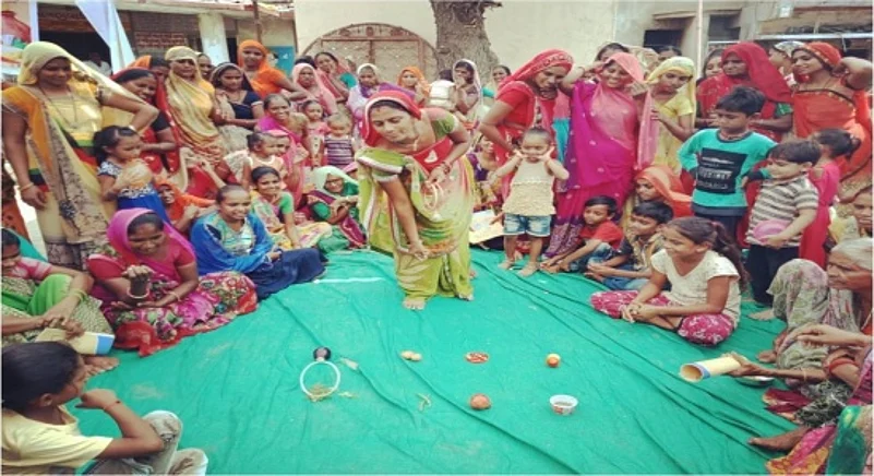 This is followed by the game of snakes and ladders. A giant board is created on the floor. The messages written on the game are based on nutrition, with special focus on gender aspects affecting the nutrition of women. Playfully, an important message is conveyed. Other methods used are the “Light Game,” the “Ring throw,” the “Wheel with Window” and so on. We at CHETNA, enjoy learning from women and developing new games and exercises to make our nutrition and health education a joyful learning experience.