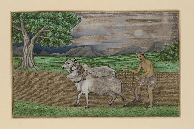 (Image: A villager ploughing with two bullocks, c 1860, Victoria & Albert Museum Collection)