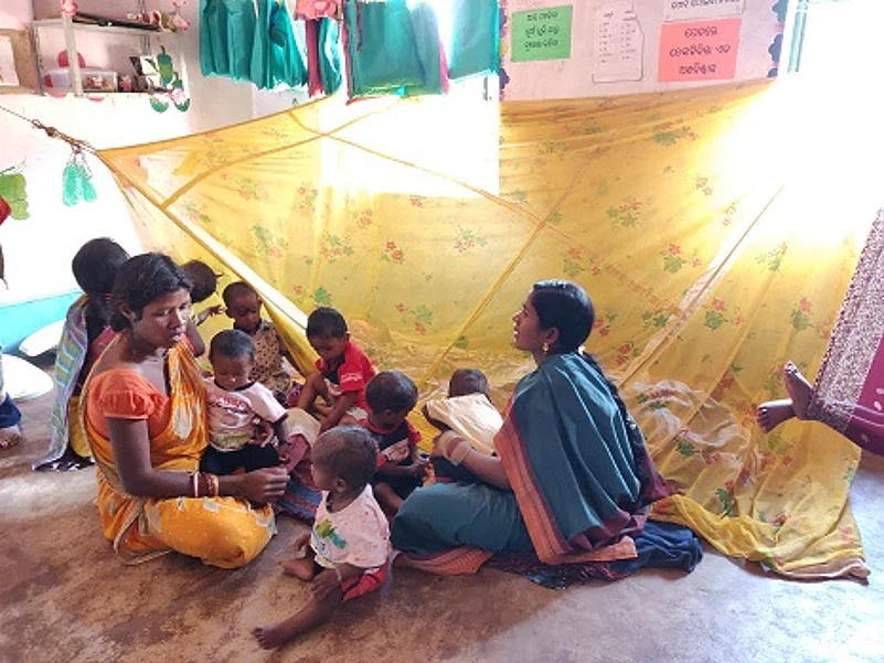 Now, 60 such creches are being run successfully in the district in partnership with the NGO Ekjut. One of 550 such foundations, the DMF in Keonjhar was set up in response to a 2015 amendment of the Mines and Minerals (Development and Regulation) Act, 1957 that mandated state governments to establish non-profit statutory bodies to work for the benefit of persons and areas affected by mining. Each Mamata Ghara can accommodate up to 20 infants and children. Each has a smokeless chulha (stove), a toilet, hand washing station, safe drinking water facility, baby weighing scales, stadiometres to measure height, and infantometres to monitor weight. A kitchen garden, often the source of some of the food cooked at the crèche, flourishes in the backyard.