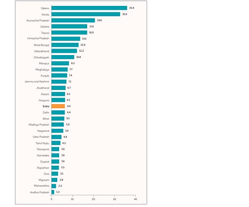Figure 2: Percentage of children aged 6–23 months receiving a minimum acceptable diet by state, India
