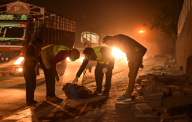A homeless man being rescued by the DUSIB team after being found on a roadside street of Old Delhi.