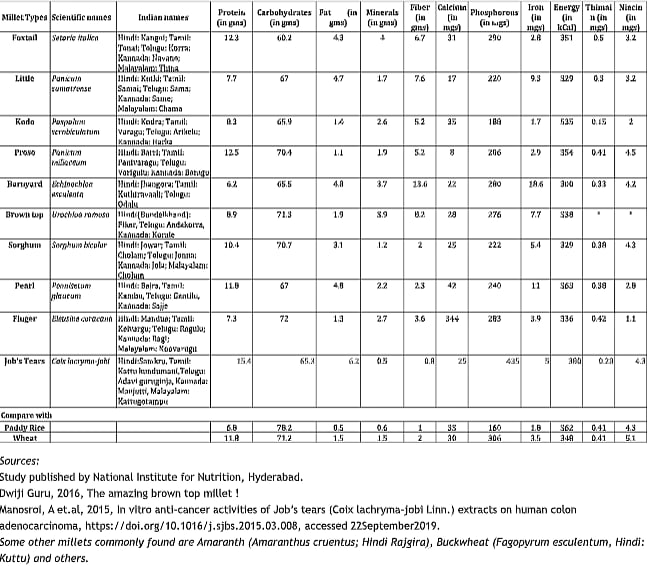 There are many types and varieties of millets. Some of them are listed here. To compare paddy and wheat are listed at the end: