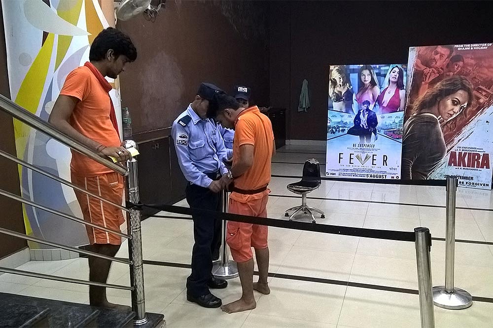 Young kaanwariyas being checked while entering a mall. Not all are pilgrims these days.