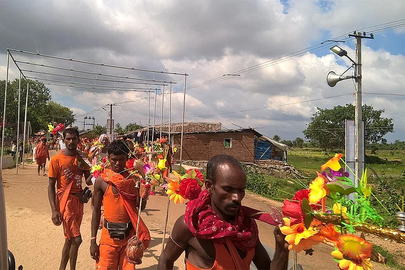 Shravan is supposed to be the month of Lord Shiva, while Monday is supposed to be his day. All through Shravan, pilgrims, known either as kaanwariyas or ‘bums’, fill water at the Ganga in Sahebganj, which is in Bhagalpur district in Bihar, and walk bare feet for nearly 105 km to Deoghar to offer the gangajal, which they carry in pots slung on their shoulders by a long strip of bamboo known as kaanwar. There are certain codes they have to follow during the pilgrimage. One: during their walk, the kaanwars address each other as “bum”. I learnt this when, on the bus from Pakur to Deoghar, a saffron-clad kaanwariya asked me, “Bum-ji, what is the time?”, though I was wearing a Flying Machine shirt and Pepe Jeans. I then realised that every person a kaanwariya meets on his pilgrimage is a “bum”. Two: all pilgrims have to practice brahmacharya or abstinence. Three: no non-vegetarian food. Although fasting is not advised—a kaanwariya may have proper vegetarian meals of rice or roti on his journey—the kaanwariyas prefer to survive only on bare essentials such as fruits or fruit juices and avoid even rice and salt to add that extra penance to their already difficult pilgrimage. Four: the containers of gangajal should not touch the ground, or else the gangajal will be rendered unfit for Baba. There are racks of wood or bamboo and even platforms made of cement all along the pilgrimage route for the kaanwariyas to place their kaanwars upon. Five: the kaanwar should be placed at a distance while the kaanwariya does his ablutions—no soap and oil allowed—takes his meals etc. And after all that is done, the kaanwariya should pray and apologise to the kaanwar before picking it up and placing it on his shoulders again to proceed with the journey.