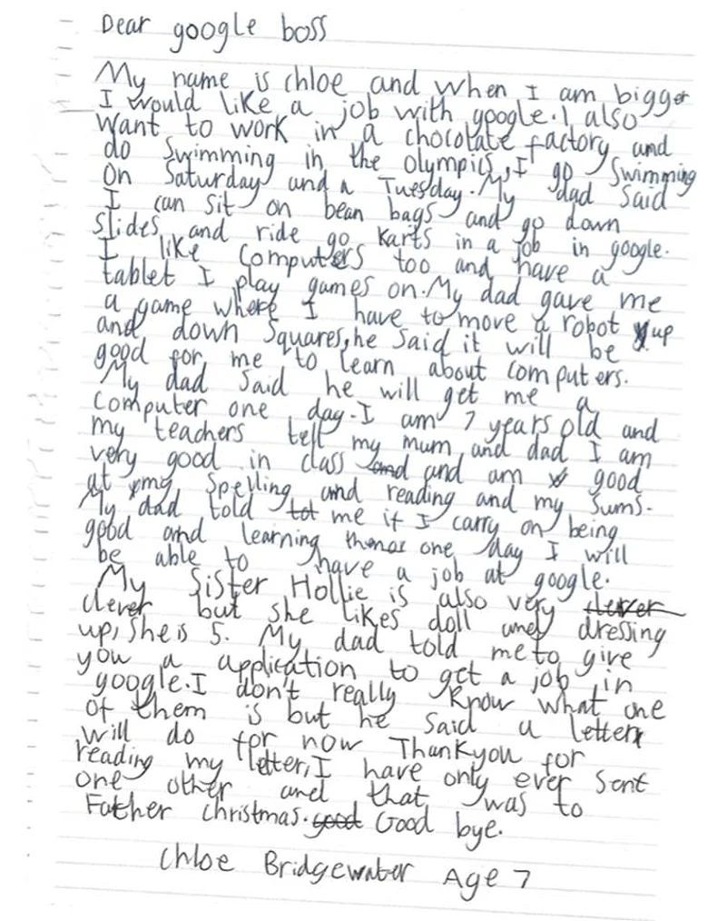 Fascinated by Kindle, tablets and robots, Chloe sent a hand written letter to the 'Google boss', expressing her desire to work at the organisation. She also wants to 'work at a chocolate factory and do swimming in the Olympics.'