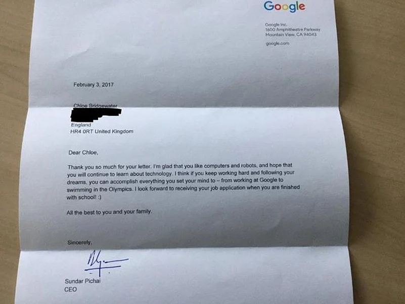 To her surprise, Chloe received a letter in response, by Sundar Pichai, the CEO himself, who encouraged her to follow her dreams and apply again when she has finished high school.