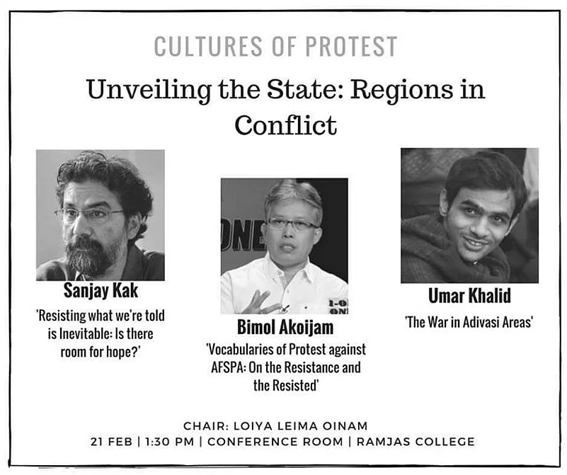 The seminar, organised by the Literary Society of the Delhi Univeristy affiliated Ramjas College, called "Cultures of Protest: Unveiling the state- regions in conflict" was scheduled for 1:30 PM today in the college's conference room. Two other speakers--renowned documentary filmmaker Sanjay Kak and JNU Professsor Bimol Akoijam -- were also prevented from entering the venue.