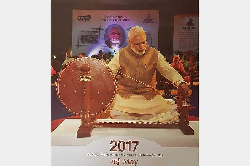 They would have seen it coming if they’d gone through the calendar issued by the DAVP (Directorate of Advertising and Visual Publicity) on behalf the Government of India for this year – where Modi is featured spinning the modern version of the charkha on the page marked ‘May 2017’.
