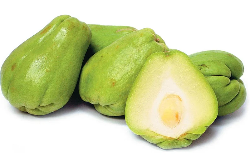 Known as vegetable pears, chayote is a subtropical member of the gourd family, along with melons, cucumbers and squash. The pear-shaped, gourd-like fruit is used as a vegetable; the tuber of the plant eaten like potatoes and other root vegetables, the leaves and shoots often consumed in salads and stir fries, especially in Asia. Like other members of its family, chayote has a sprawling habit and grows only over large expanses. It tastes similar to zucchini and is commonly used in Creole cuisine, especially around New Orleans in winter, as a festive dish with seafood stuffing. The fruit is usually served with mild seasoning. It is rich in amino acid and vitamin C, and has diuretic and anti-inflammatory properties. A tea made from the leaves has been used in the treatment of arteriosclerosis and hypertension, and to dissolve kidney stones. In Tamil Nadu, chayote is known as seemai kathrikai and is widely used in sambars, kootu, poriyal, thuvayal, chutney and mor-kulambu.