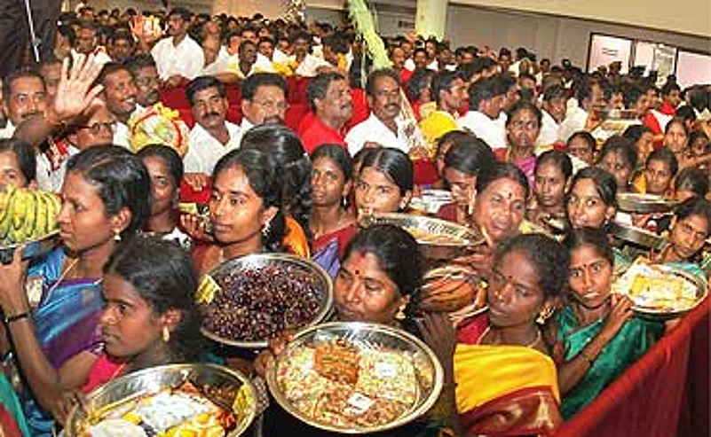 DMK patriarch M Karunanidhi may not have got three cheers from his sonsStalin and Azhagiri on his 85th birthday as their feud burst out into the open.But he got many rounds of applause for the gift he handed out literally on aplatter on his birthday. Perennial breakfast favourites like idlis, dosais,vadais, pongal and coffee/tea have been ordered to sell for 10-15 per cent less.And a meal will now cost Rs 20 after food minister A V Velu arm-twisted theTamil Nadu Hotel Owners' Association so that the DMK can puff up its chest whengeneral elections come next year. The good news is that for the moment at leastidlis, dosai, etc continued to be as big and neither has the taste beencompromised. But for all the rah rah from the DMK camp, the common folks are nothappy. "What is being offered as a low priced meal is actually a low weightmeal," griped a customer upset that he did not get second helpings ofporiyal (vegetables) and kootu (a kind of dal). Ah well, you can't win them all.