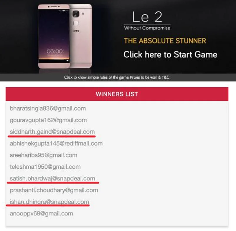 When the results of the ‘lucky draw’ were announced, there were three victors with email IDs ending with the snapdeal.com domain name.