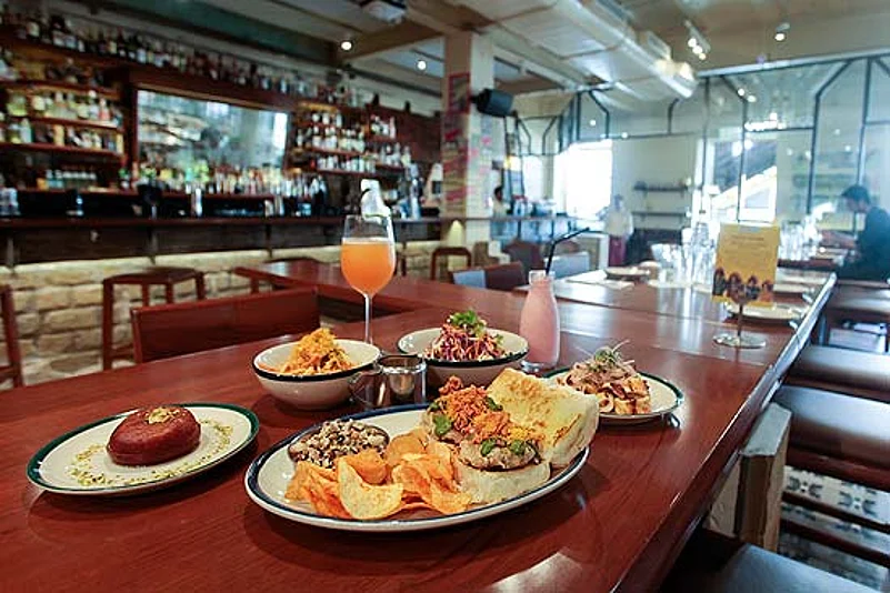 On a hot afternoon we start with the excellent Peach Iced Tea, flavourful strawberry lassi, orange juice garnished with tulsi and watermelon juice (Rs 200 each). Then comes a bada pao sandwich (Rs 250) filled with melt-in-the-mouth tandoori pork. This is a hit, as is the Chargrilled Chilli Calamari (Rs 300). But the starter I adored is the Seafood Bhel (Rs 300)—a punchy chaat tossed with finely sliced vegetables, seafood and sev. The Vegetable Kothu Roti (Rs 350)—a Tamil street food in which a shredded roti is mixed with vegetables, roasted cauliflower, disco pumpkin and then topped with coconut gravy—is a winner. The Kerala-style Red Snapper wrapped in Banana Leaf (Rs 500) is enjoyable too. Only the Shrimp and Kairi Biryani (Rs 600) is disappointing. That, and a sense that the meal is a bit heavy on coconut. As for the desserts, the Old-Monk-soaked Gulab Jamun (Rs 200) is spectacular. The flaky Guava Tart topped with chilli ice-cream (Rs 250) is exemplary. And the St Andrews Mess (Rs 300)—chopped mango, meringue, vanilla ice cream and aam panna—feels like a home experiment gone right.