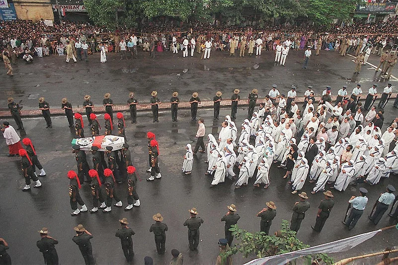Those seven days witnessed people from all walks of life moving in sombre silence, mostly tearful and some openly sobbing, to pay their final respects to Mother Teresa. The dignitaries were there in hordes too—then prime minister, I.K. Gujral, Phoolan Devi, heads of states and their representatives, Vatican officials.... These few days saw Calcutta at her best—a city that simultaneously took on the roles of a generous host, grieving orphan and, finally, a child ever conscious of its duty that left no stone unturned in paying a fitting tribute to its own Mother. As Mother’s funeral cortege entered the lane of Mother House, the skies opened up and the drops of rain that fell were almost like water of the Ganges on Bijoya Dashami, claiming the Mother for her heavenly abode after she did her part in vanquishing the evil of indifference to poverty and the pain of the poor on earth.