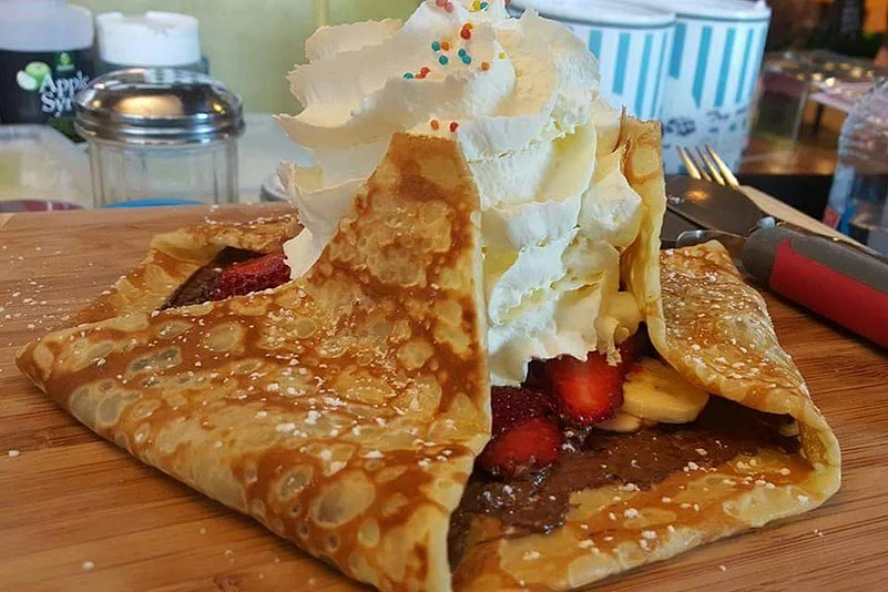 Pune has long been a foodie’s delight. It has the space, the expat community and the quirky spirit that together have thrown up a bunch of brave, yummy experiments. The latest is the small but wonderful French Creperie, tucked away in the leafy lanes of Koregaon Park. The decor is simple—two walls of glass, white and light furniture, and a few prints and photographs of Paris. All the action is concentrated in the long counter that runs along one end. It is here that salads are mixed, drinks are poured and magnificent sauces are folded into perfect crepes by the French couple who runs this little gem.