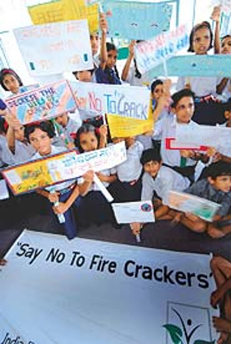 question has even been posed. "Which of you've pledged not to burst crackers this Diwali?" All hands stay up. Ask, "What's wrong with bursting crackers?" and the answers come fast as rockets. "You can go deaf," says one 11-year-old. "You can get asthma," says another 6th-grader. All 150 sixth-grade students have resolved to boycott crackers this Diwali—and to persuade others to do so too.