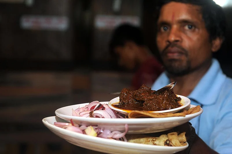 “We only serve roti and kosha mangsho,” snapped a manager, who refused to comment on the establishment’s changing hands many times over the past century and more. Though there is a tiny seating arrangement with a few small tables and chairs, most of the eating—or gobbling down, as it were—takes place standing outside, by the side of the road, with the chaotic traffic passing by and ceaseless honking of horns for atmosphere. However, one bite into a succulent piece of mutton wrapped up in a tiny bit of torn chapati, and you will forget the surrounding, when you are one with the food you are savouring.