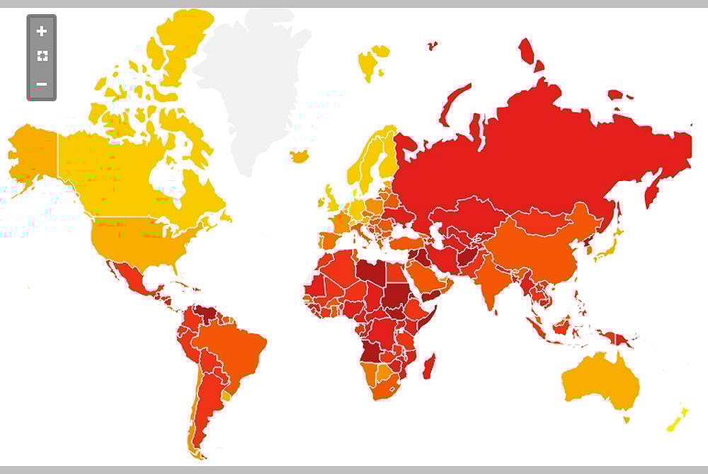 “Over two-thirds of the 176 countries and territories in this year's index fall below the midpoint of our scale of 0 (highly corrupt) to 100 (very clean). The global average score is a paltry 43, indicating endemic corruption in a country's public sector,” said the group.