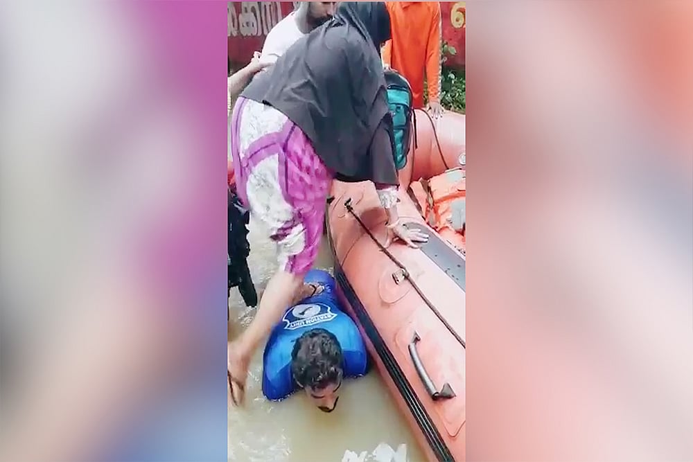Jaisal KP, a 32-year-old Tanur resident (fisherman by profession) knealed down in waist-deep water to rescue three stranded women, one with an infant, so that they could step into an inflatable boat in Vengara's Muthalamad area.