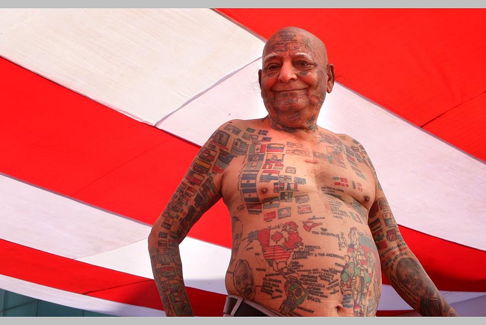Later, he got 366 flags of various nations tattooed on his body and soon had all of his teeth removed so that he could fit 500 straws into his mouth and 50 burning candles too.