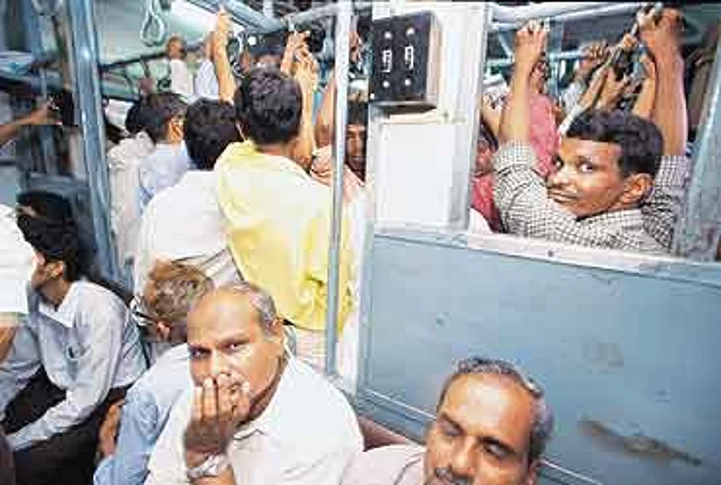 Many of them live so far away from work that if world marathon record holder Khalid Khannouchi started his 42-km run around the time when they set out, he will reach faster. Enduring decibel levels of about 90, many times higher in intensity than what the human ear was made for, they take various connecting mediums to the nerve centre of all life out here. The railway station. Monstrous groups of men and women stand looking in one direction, ready to push, shove and hit people they don't know in the middle of deep-throated yells, to get into a train that during peak hours carry 4,000 passengers while it was designed for 1,700. They are teachers, salesmen, executives, students, prostitutes, bank employees, journalists, secretaries, bookies. The entire Mumbai economy. Between nine and eleven in the morning, over one lakh passengers have gone somewhere in these trains. In each compartment, some 400 people stand with not an inch to move, looking down or up in a space that by Indian law is not permitted to hold more than 80 animals.