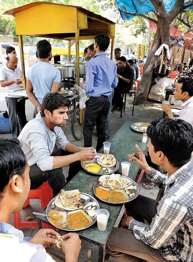 Office goers grab a quick lunch from a roadside kiosk in Delhi