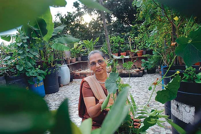 They have all read about how she, as the catering officer of Mumbai’s Port Trust, galvanised her department workers into turning the 3,000 sq ft terrace adjoining the canteen into a lush ‘forest’. They are amazed at the fact that her edible garden recycles 20 kg of waste generated by the canteen’s kitchen everyday. They have seen pictures of her garden’s abundant yield on the net. There’s tulsi, mint, startlingly tasty veggies like spinach, okra, brinjal and cherry tomatoes that are often plucked and eaten raw by Port Trust workers—and, of course, fruits like guava, custard apples, mangoes, bananas and even coconuts, harvested from a gigantic palm that rests on the terrace wall. And so here they are, forsaking holiday laziness on a Sunday morning, to learn how to become urban farmers.