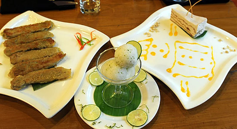 Bannerjee was largely responsible for creating Oh Calcutta’s menu, and when he started his own restaurant, he wanted to do something completely different. In his words, “If you think Bengali cuisine is only about bony fish and mustard, think again”. The result is a menu that presents traditional Bengali flavours in ways that will surprise and delight you. Think panchphoron chicken escalopes. Or gandhoraj sorbet. Or malpua-and-chhaana cheesecake. We were invited here by the noted foodie, Ram Ray, and he and Bannerjee began with an intense discussion on what to order. I know we started with a lettuce ’n cheese salad with a fragrant gandhoraj dressing, but then I lost track of all the dishes that followed; I remember only the procession of wonderful flavours exploding inside my mouth: panchphoron (five spices), gandhoraj (Bengal lime), kalojeera (black cumin), kashundi (mustard sauce) and topakul (jujube berries) among them. Bannerjee is currently reworking his menu, and we can’t wait to try the creative new dishes he told us about, like...oops, sorry, we’re not allowed to talk about them, or else he’ll administer Death By Malpua.