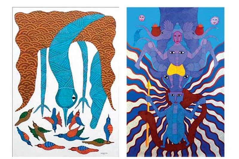 Assimilating 40 of the best pieces of art by award-winning Gond artists Bhajju Shyam,Venkat Shyam and Roshni Vyam—Satrangi: A Gond Expression—is a collage of works in seven colours. The polychrome works are intricately structured and layered and leavened with humour, giving a rainbow look to the collection. The intricate lines and dots tell stories and narrate emotions. Roshni explores emotions while Venkat brings forth his love for the oral tradition and nature. The art of Bhajju, who is well-known, has a vibrant, other-worldly feel, merging nature and mythology. Till Sep 6, Ojas Art