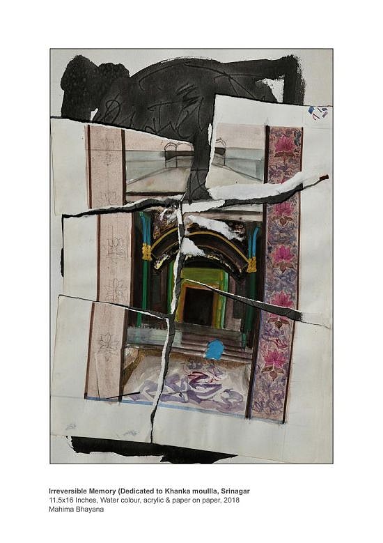 One of Mahhima's works stands in contrast with the rest. It's an earthily-coloured sketch of what looks like a durgah. Only, it has been torn into pieces and pasted on a dark, almost charred, background. This one has a heartbreaking backstory. Mahhima drew this while she was in Kashmir last summer. It's one of the entrances of the ancient Khanqah-e-Moula shrine in Srinagar. "I was so taken by the Khanqah that I drew this. I later heard the news that much of the shrine was damaged in a fire, including the part I had drawn," says Mahhima. Hence, this jarring reinterpretation.