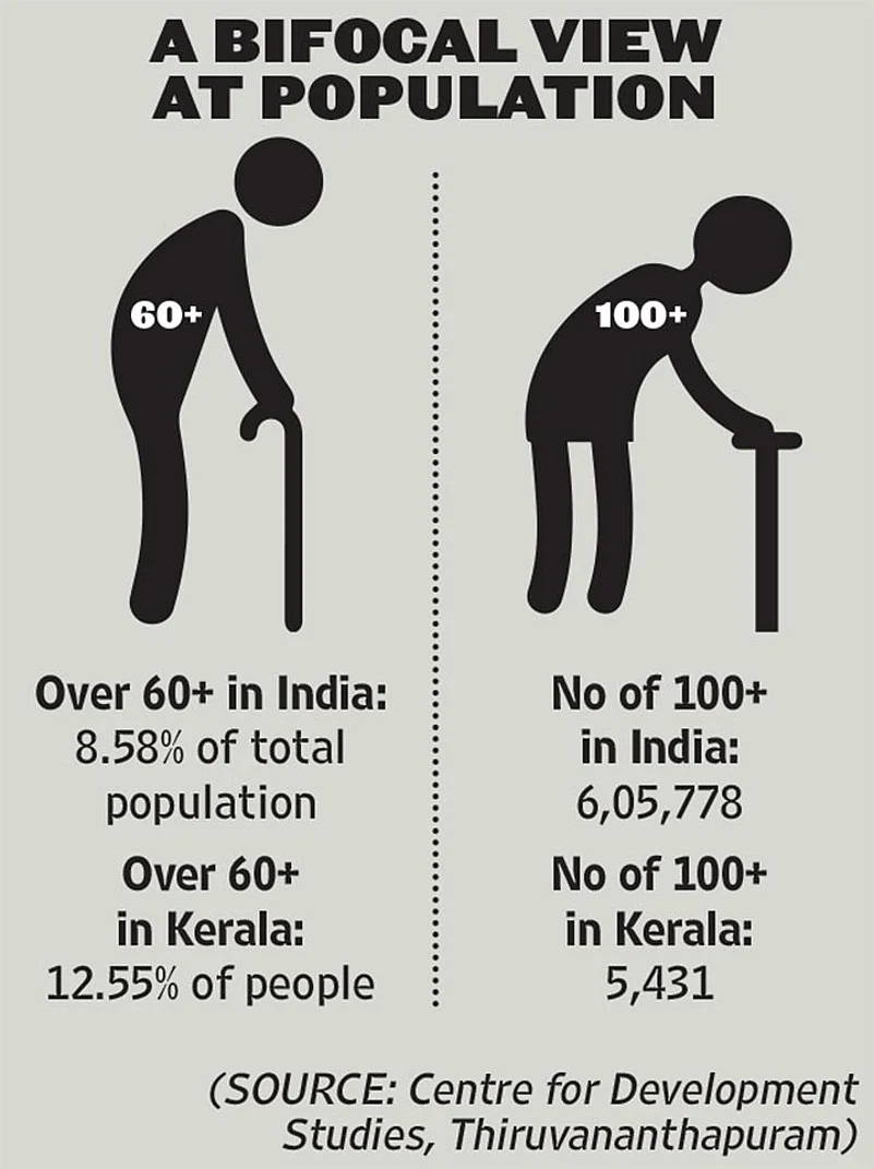 A few of Kerala’s public figures are celebrated nonagenarians. Former chief minister V.S. Achuthanandan is 93, courtesy a disciplined lifestyle, while his one-time Communist party colleague, ex-minister K.R. Gouriamma, is four years older. Both hail from coastal Alappuzha district and retain remarkable memory. Some among the more ordinary people have surpassed the politicians’ indefatigability, and added another decade to the magical 100. In 2015, the oldest woman in Kerala, Rosa, died at the age of 112 in Thrissur.
