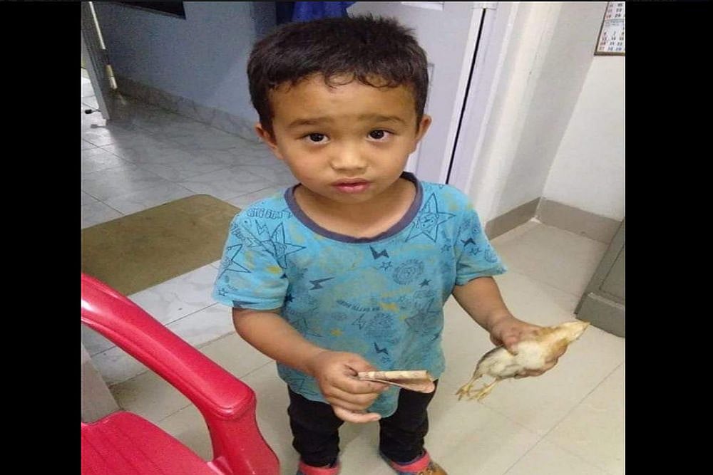 "According to the father, the boy came home with the neighbour's chick that he had accidentally killed. He does not understand that the chick is dead and begged his parents to take the chick to the hospital. His father told him to go himself, which he did with ten rupees. Later he came back sobbing, saying that they didn't help the chick but only took his picture with the chick and his money. He vowed to go back carrying a 100 rupees. His parents finally had to explain to him that the chick is dead and that there's nothing they can do at the hospital. His father says that he was as surprised to see his son act this way and did not expect him to actually go to the hospital or that the picture they took of him will go viral. "He's always been a rather unique kid." he adds.