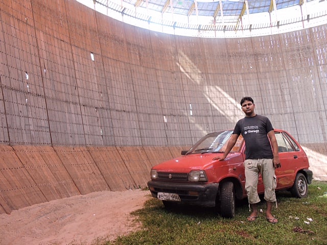 For Ansari and his 25-member team, the last few days in Siliguri has been busy on the occasion of Durga Puja. Amid a pulsating crowd, Ansari and four other stuntmen – one of them on a bike and the rest in another car – as they defy gravity and death to race around the vertical walls of the "well", which is around 12 metres in diameter.