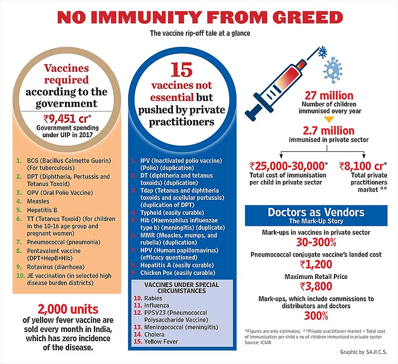 Under the Drugs and Cosmetics Act, 1945, paediatricians are required to maintain records of every vaccine dispensed by them, to ensure only registered medical officers dispense or prescribe such vaccinations. Outlook asked several paediatricians for such records but they were unwilling to provide them. Moreover, there is no government or non-governmental authority where such records need to be submitted by paediatricians. This unregulated scenario has opened a huge market for non-authorised doctors to sell such vaccines.