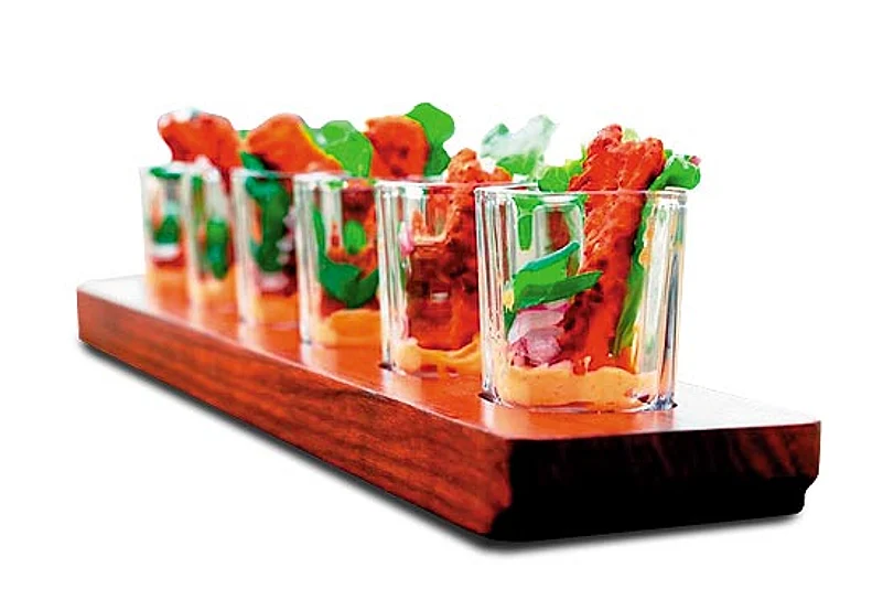 Our evening started with the Bubble Gum Cocktail (bubblegum-flavoured vodka, sweet-and-sour mix, egg white), which proved itself worthy of its reputation. The fruity flavour tingled the palate most agreeably. We graduated to Wood Pepper, a wood-smoked cocktail with tequila, red wine, red bell pepper, mint, ginger syrup, fresh lime juice, sprite and topped up with a float of red wine. The woody aroma was heavenly, but against the well-meant advice of our minders, we stirred our drink, rather than savour it in layers, and found it rather heady. The Achari Mojito (white rum, lemon mint, sugar, achar, club soda, spiked with a spray of mint) was a bit of a let-down: it was too much like aam panna, not sufficiently infused with the achar influence. But we wound down with a whisky sour, which more than compensated with its mature smoothness. As accompaniments, we sampled some more fusion: blue cheese malai tikka with tomato, olive and berry salsa, crispy prawns tossed with curry leaves, and feta cheese-stuffed beetroot patties with sweet and spicy mango chutney, all of which were middling good. What stood out was the Amritsari macchi with kochujang mayo.