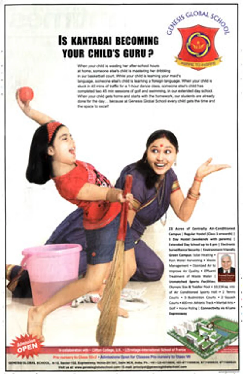 That’s how a recent full-page advertisement of the Genesis Global School in Noida began. “When your child is wasting her after-school hours at home,” the pitch went on, “someone else’s child is mastering her dribbling in our basketball court. While your child is learning your maid’s language, someone else’s child is learning a foreign language…”