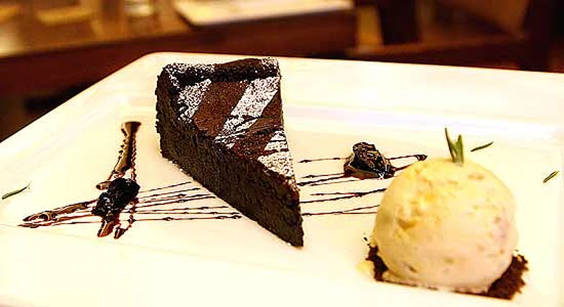 The runny-egg-lovers were delighted with their eggs benedict (Rs 260)—and even I, who dislike wayward yolks, had to admit that the English muffins topped with slices of chicken ham, poached eggs and Bearnaise sauce were addictive. When paired with chicken sausages (Rs 110), it made for a substantial treat. But all this paled into insignificance compared to the breakfast bagel sandwiches. The Salt Water Cafe bagels are perfect—soft, warm, chewy and marvellous with lashings of cream cheese (Rs 210). But the dish of the day was, without contest, the bagel sandwich with cream cheese and smoked salmon (Rs 500). Definitely worth repeating at every visit. Finally, we cheated a bit by sampling two dishes that were off the breakfast menu. The tenderloin burger with fried egg and tomato-mustard chutney was succulent and flavourful (Rs 400). While the fluffy flourless chocolate fudge cake served with caramel ice cream (Rs 250) proved to be the perfect way to end a lazy, indulgent morning.