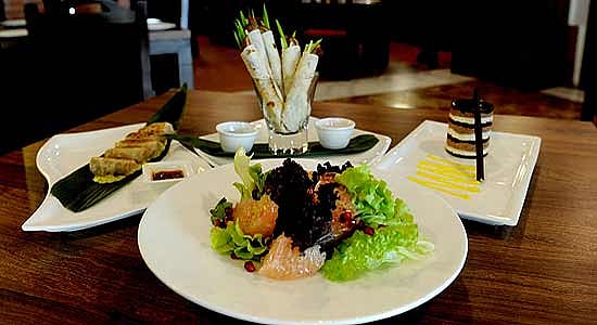 The house speciality is the Peking Duck, but we decided instead to order a variety of starters: sweet-and-sour pomelo salad, crisp panko prawns, dumpling-like lamb kothe, and aromatic duck pancakes—each with its own set of accompanying sauces. We followed this with garlic rice and chicken hotpot, redolent with star anise. Then, finally, Kahlua mousse and a huoshan that oozed molten chocolate at the touch of a spoon. Two problems at any East Asian restaurant are the vegetarian menu and the desserts, but the airborne monk offers an excellent choice of both. The food is good, and the value proposition cleverly worked out, offering food you would expect from a fine-dining restaurant, but without the fine-dining prices. Hao chi, as they say in Mandarin.