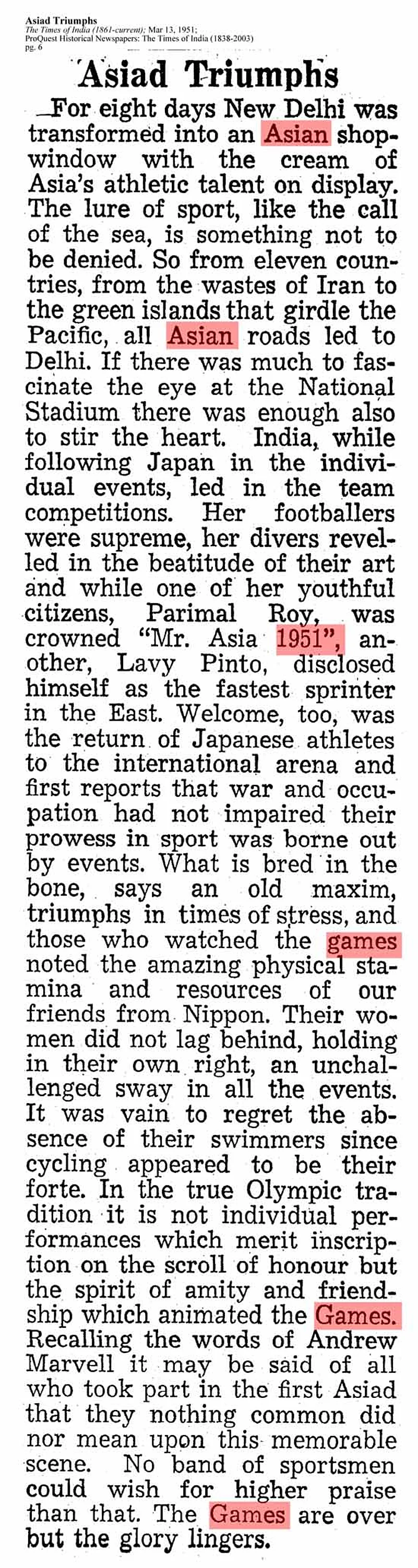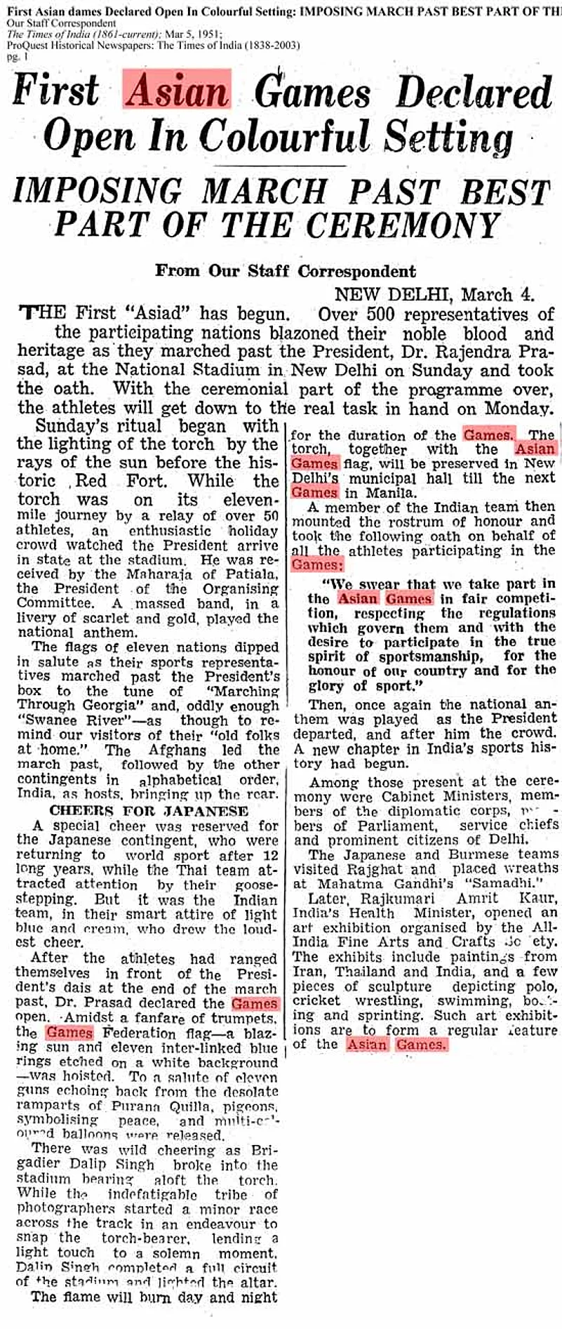 This first Asian Games was an Indian initiative, which was intrinsically linked to the larger Indian self-image of being a major Asian power and the Nehruvian idea of India’s centrality in a new global order. The Games were deeply tied to the ideals, hopes and aspirations of Nehruvian India. They are also a useful prism to understand the struggle for Asian leadership that unfolded thereafter. As Indian administrators went about creating the Asian Games Federation and the first Delhi Asiad of 1951, they were also driven by the idea of a resurgent independent India and Nehru’s notion of a new world order: decolonized states, led by India, marching forward to take their rightful place. At the heart of the story of the Delhi Asiad was a desire for newly independent India to be noticed, the moment of arrival signified by an international event of Olympian proportions. Writing in 1959, Anthony de Mello, the main organizer of the 1951 Asiad, recounted the opening ceremony in words that merit repetition, “What was the greatest moment in Indian sport? there was never an occasion to beat that of March 4th, 1951. On that historic day for the sport of India—indeed for the sport of Asia, even the world—the first Asian Games were opened…It was Asia marching ever nearer to the great Olympic ideal of ‘Citius, Altius, Fortius’—faster, higher, stronger….India—the ‘Big Brother of Asia’—had given the lead in this the finest sporting venture of the Orient.”