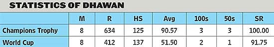 So far, Dhawan has made 1,046 runs in World Cup and Champions Trophy—the fastest to do so. Till the end of the league phase, he was the Champions Trophy top scorer with 271. At the 2013 Champions Trophy, also held in England, he averaged 90.75, with two centuries in five innings. He was the top run-getter, with 363 in five matches and was adjudged the Man of the Tournament as M.S. Dhoni-captained India lifted the trophy.