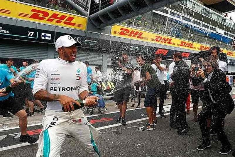 The 33-year-old Briton, who reeled off the 11th win of a dominant season that brought him his fifth drivers' world championship ahead of four-time champ Sebastian Vettel, showed off his tattooed torso on the podium amid goodbyes for former foe Fernando Alonso, who retired from F1 after 17 years and 311 GPs.