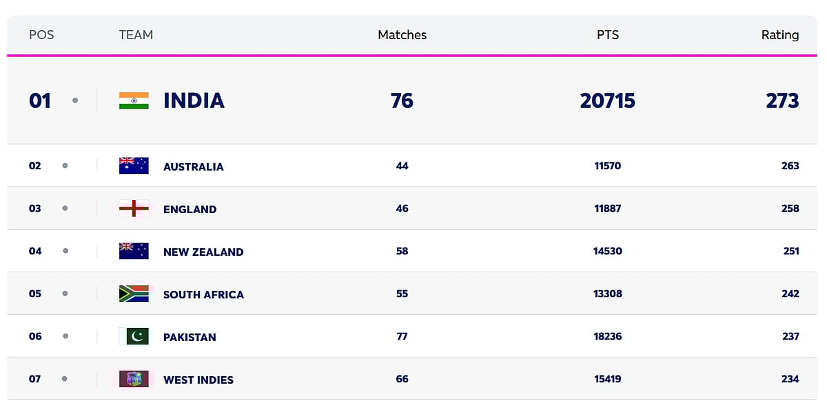India (273 points) remain the numero uno side in ICC's T20I team rankings, followed by Australia (263) and England (258).