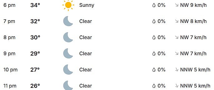 6:00 PM (34°C): Sunny and hot; 0% rain probability.