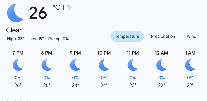 8:00 PM – 11:00 PM (25°C): Perfectly clear under lights; 0% rain probability.