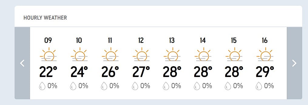 Though Delhi witnessed some rain in the lead-up to the match, the skies are expected to be sunny today, with next to no chance of downpour. The probability of precipitation is zero percent and the maximum and minimum temperatures are predicted to be 29 and 22 degrees Celsius, respectively. So expect a rain-free day with hazy sun. Let us take a look at the predicted hourly weather: