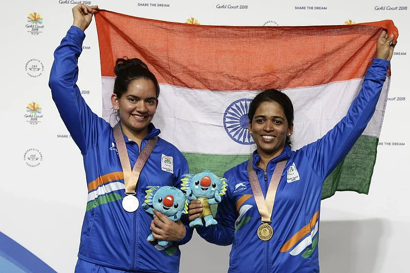 In a 1-2 finish for India, the 37-year-old Tejaswini shot a CWG record 457.9 in the event's finals, while Moudgil aggregated 455.7 at the Belmont Shooting Centre.